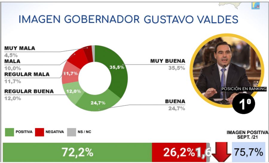Valdés registra una imagen positiva del 72,2%+ y 26,2 -) , seguido por Sergio Uñac de San Juan 70,7%+ y 26,8%-%; Gerardo Morales de Jujuy 70,2%+ y 26,3%-, Rodolfo Suarez de Mendoza 69,6%+ y 27,7%- y Hoacio Rodríguez Larreta Caba 67,2%+ y 28,5%-