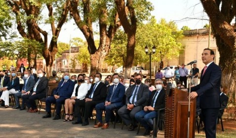 Las actividades de este jueves 10 de febrero, comenzaron a las 9, con la tradicional ceremonia en la plaza 9 de julio, donde hicieron uso de la palabra el mandatario provincial y el jefe comunal.