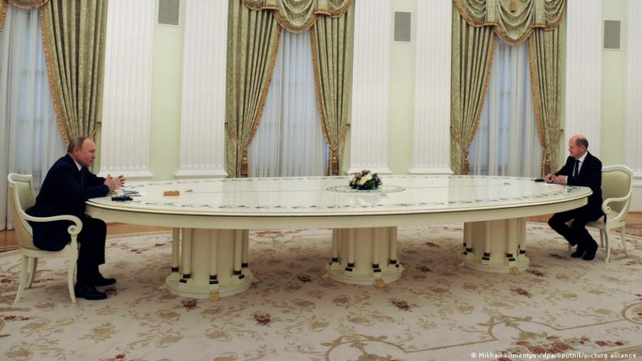 Ambos dirigentes estaban sentados en una mesa larga de seis metros, medida sanitaria anticovid del Kremlin para los huéspedes extranjeros de Putin que rehusaron someterse a un test, según un protocolo ruso.