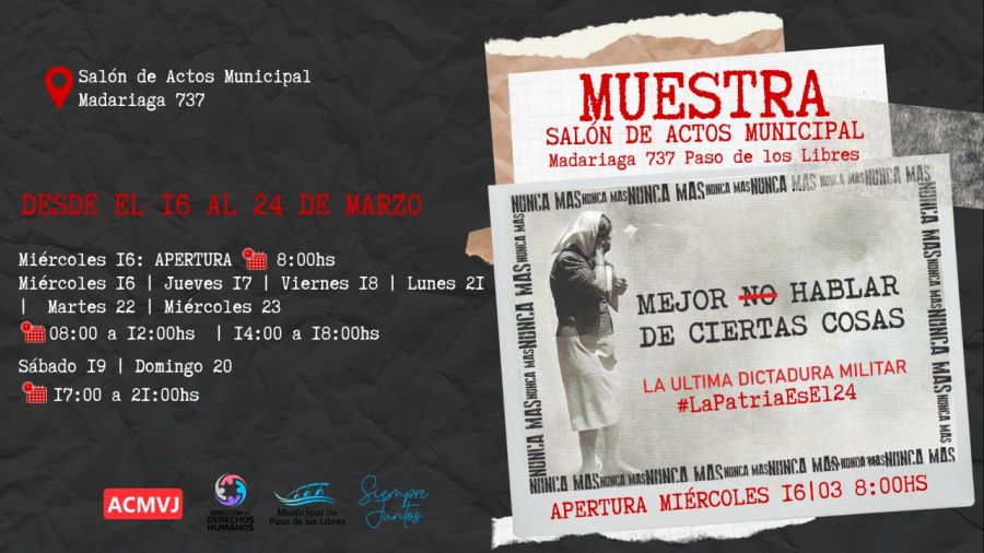 • En Salón de Actos Municipal (Madariaga 737): Muestra “Mejor no hablar de ciertas cosas”. La última Dictadura Militar.