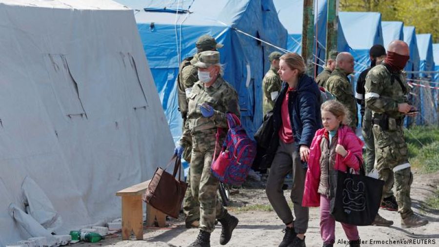 Fotógrafos de Reuters, sin embargo, captaron su entrada a un campamento de alojamiento temporal en tiendas de campaña tras llegar en autobuses de matrícula rusa escoltados por vehículos con distintivos rusos, unos, y de Naciones Unidas, otros. El 24 de abril, el alcalde de la ciudad Vadim Boychenko dijo que más de 100.000 personas permanecían en la ciudad. En la planta de Azovstal permanecen refugiados unos mil civiles y soldados ucranianos, entre ellos unos 600 heridos, a la espera de ser evacuados.
