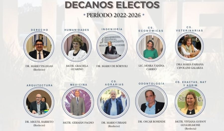 Las Unidades Académicas que eligieron nuevos decanos son: Facultad de Humanidades eligió a la magíster Graciela Guarino como nueva titular; la Facultad de Ingeniería tiene como nuevo decano al doctor Mario De Bórtoli; Ciencias Económicas eligió a la licenciada, Moira Yanina Carrió para encabezar sus destinos; la Facultad de Ciencias Veterinarias en tanto, eligió a la doctora Maria Fabiana Cipollini Galarza quién se transformó de esta manera en la primera mujer en asumir el cargo de Decana de esa Unidad Académica. La Facultad de Odontología en tanto, eligió como nuevo decano al doctor Oscar Rosende y finalmente, la Facultad de Medicina designó al magíster Germán Pagno como nueva autoridad de esa Casa.