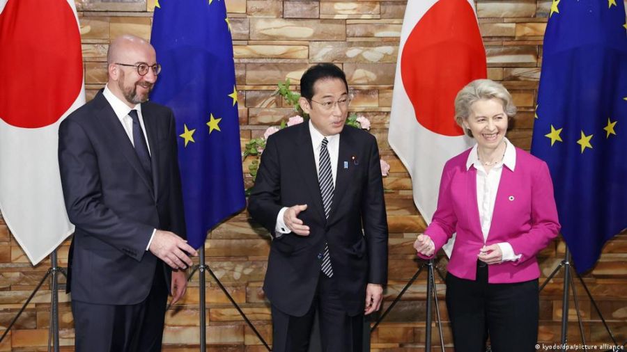 El primer ministro nipón, Fumio Kishida y los presidentes del Consejo Europeo, Charles Michel, y de la Comisión Europea, Ursula von der Leyen, celebraron el jueves (12.5.2022) una cumbre en Tokio, cuya agenda estuvo centrada en la guerra de Ucrania y en las tensiones crecientes en la región de Asia-Pacífico.
