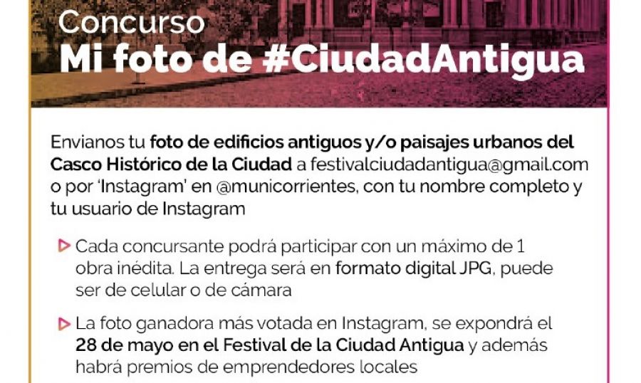 En el marco de la segunda edición del Festival “Ciudad Antigua” y con el aporte y auspicio de la Municipalidad de la ciudad de Corrientes, el Instituto de Cultura y el Senado de la provincia de Corrientes se realizará un concurso abierto a todos los vecinos de la ciudad. Hasta el 25 de mayo, los interesados tienen tiempo de enviar sus propuestas.