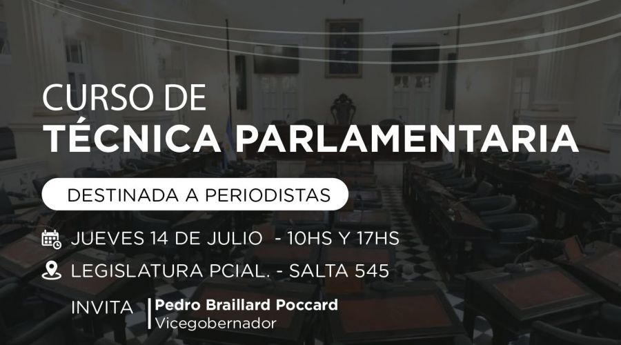 El Vicegobernador Dr. Pedro Braillard Poccard, invita al Curso de Técnica Parlamentaria que se realizará en la Legislatura Provincial, el jueves 14 de julio en dos horarios, a las 10 hs. y a las 17 hs.