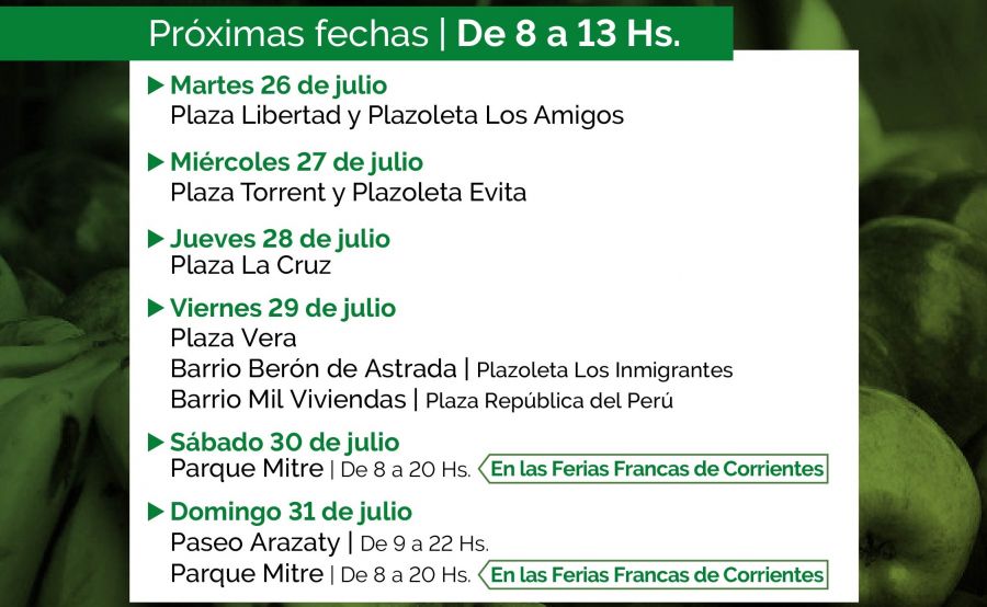 En tanto, el jueves 28 las ofertas estarán disponibles en plaza La Cruz del barrio del mismo nombre (Salta y Belgrano). El viernes 29 en el mismo horario de 8 a 13, los feriantes se instalarán en tres espacios verdes: Plaza Vera (Pasaje Agustín González), Plaza República del Perú (Pitágoras y La Paz) del barrio Mil Viviendas y plazoleta de Los Inmigrantes del barrio Berón de Astrada (A. Correa Fernández y Av. Sarmiento).