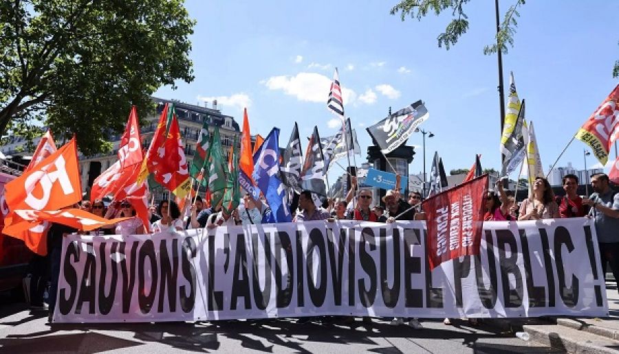 Los empleados del sector público de la radiodifusión se manifestaron en París el 28 de junio de 2022 para protestar contra la propuesta de supresión de la "Redevance Audiovisuelle". © Thomas Coex, AFP