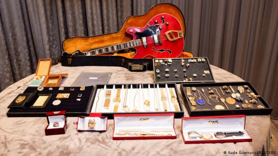 Vista de una guitarra y una colección de joyas personales de Elvis Presley y el coronel Tom Parker, perdidas durante décadas y que serán subastadas en línea en Hollywood, California, EE.UU,