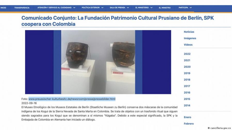 La fundación alemana de Patrimonio Cultural Prusiano (SPK, por sus siglas en alemán) negocia con la embajada de Colombia en Berlín la devolución de dos máscaras de la comunidad indígena Kogui, según dio a conocer este viernes (16.09.2022) en un comunicado.