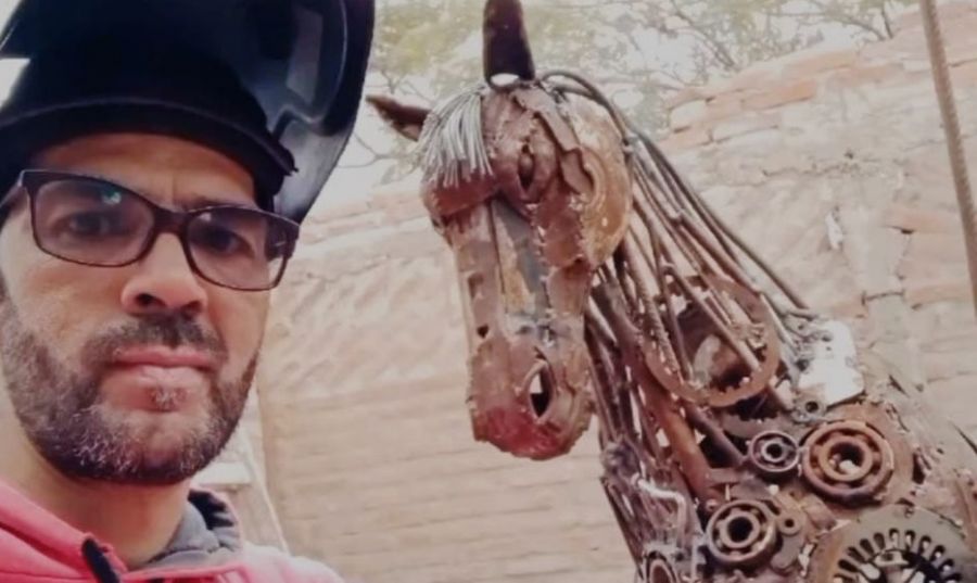 "Inicié con la música, por el año 2003, con la percusión, y hoy en día toco con más de cuatro bandas. A la par trabajaba en construcción. Soy albañil, y en colación, en los últimos años, me dedique a la bioconstrucción. Hice tres casas de barro. Hace un año atrás, unos de los oficiales me obsequió una máquina de soldar y me dió la posibilidad de entrar al mundo de la herrería artística. Hoy, me dedico a reciclar metales. Este es un sueño que siempre tuve, cuando fui viajero y tallaba maderas con figuras en tres dimensiones. Siempre tuve la idea fue fusionar tallado con metales. Hoy, en mi taller solo lo hago con metales, con el objetivo de que la escultura ingrese al mundo diario", afirma "Palito" Aguirre sobre su obra.
