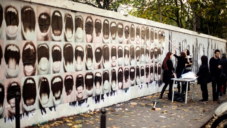 La obra de Graciela Sacco se desplegará a través de unos 60 metros de largo, empapelados con estas bocas: catorce afiches diferentes (aunque similares) y alrededor de 60 impresiones de cada uno que se van a disponer en este extenso muro de tres metros de alto, una empalizada que va a estar dentro del Jardín.