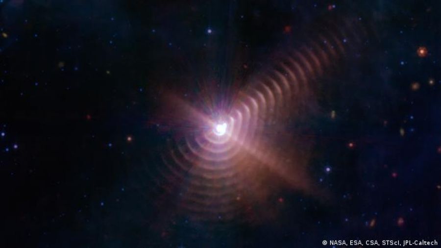 Ahora, el estudio complementario de WR140, el telescopio espacial James Webb (JWST) de la NASA fue capaz de ver a mucha más profundidad para tomar una imagen no de una sola pluma de polvo en aceleración, sino de casi 20 de ellas, anidadas unas dentro de otras como un conjunto gigante de pieles de cebolla.