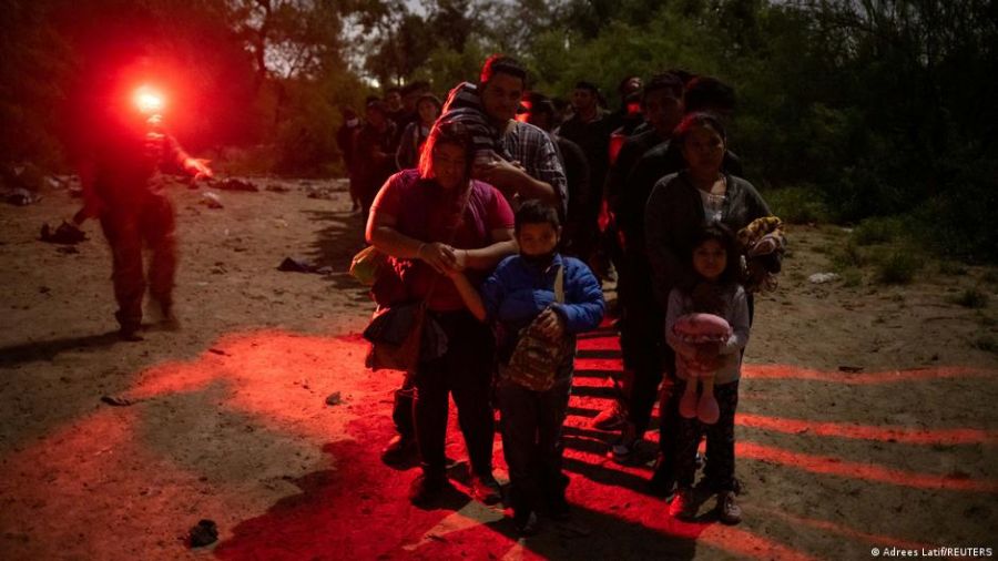 Miembros de la Guardia Nacional de Texas escoltan a un grupo de inmigrantes que atravesó el río Rio Grande para entrar ilegalmente en Estados Unidos.
