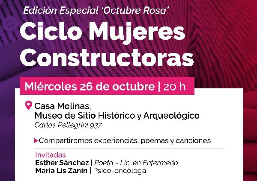 En el marco del ciclo “Mujeres Constructoras” que se desarrolla el último miércoles de mes en Casa Molinas –Pellegrini 937-, este 26 de octubre, desde las 20, se desarrollará una charla a cargo de la psico-oncóloga María Lis Zanin y la poeta y licenciada en Enfermería Esther Sánchez. En esta oportunidad, se trata de una edición especial denominada Mes Rosa, en alusión al color del lazo que identifica a la lucha contra el cáncer de mama.