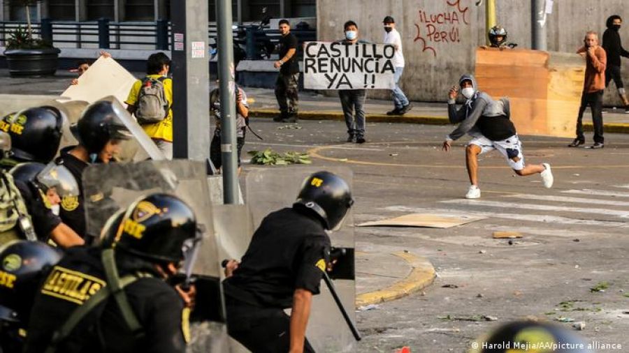 Los opositores al gobierno de Castillo recorrieron las calles del centro histórico hasta llegar a 100 metros del Congreso donde decenas de policías antidisturbios impidieron con gases lacrimógenos que los manifestantes llegaran al Parlamento y al palacio de gobierno.