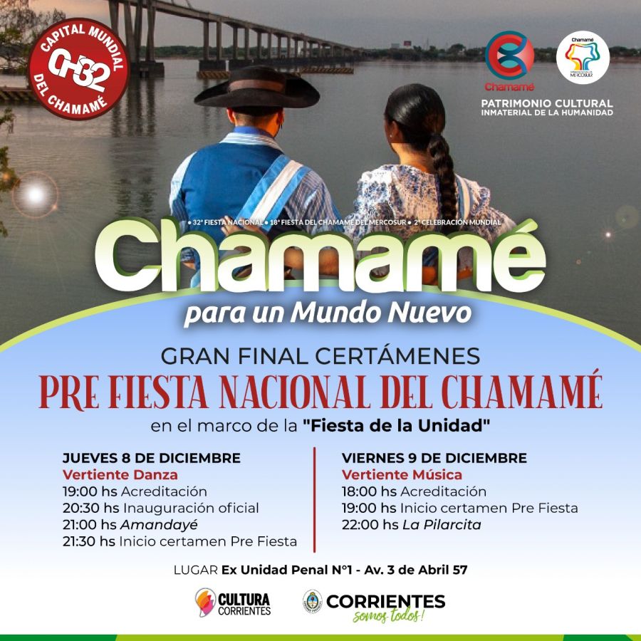 Además, la Gran Final de los certámenes Pre Fiesta del Chamamé se desarrollará el jueves 8 y viernes 9 de diciembre en la ex Unidad Penal Nº1, en el marco de la Fiesta de la Unidad. La primera jornada dará inicio a las 19 horas, con el selectivo de la vertiente danza, y la actuación de Amandayé; mientras que el segundo día será el turno de la vertiente música y cerrará con la actuación de La Pilarcita.