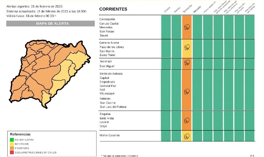 La información específica que se esperan tormentas fuertes en todos los departamentos de Corrientes, a excepción de los que limitan con la costa del Río Uruguay, donde hay alertas simples.