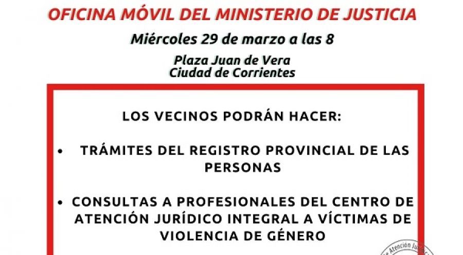 El Ministerio de Justicia y Derechos Humanos pone en marcha su Oficina Móvil, que se estrenará este miércoles desde las 8 en la Plaza "Juan de Vera" de la ciudad de Corrientes.