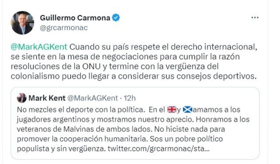 Por último, hizo eco de las acusaciones de Kent, quien lo calificó de "político populista" por vincular al fútbol con la pelea por la soberanía de las Malvinas, al responder que se trata de una práctica habitual entre los argentinos. "Con su opinión no me ofende a mi, ofende a nuestro pueblo que honra en las canchas a "los pibes de Malvinas" que jamás olvidaremos", concluyó Carmona.