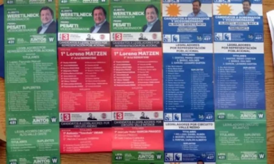 A partir de una reciente reforma del Código Electoral se incorporó la “adhesión de boletas” consistente en que un partido o alianza sin propuesta pueda anexar la de otra fuerza. El radicalismo, sin propuesta para gobernador, adhirió a la candidatura de Weretilneck, por lo que la papeleta tendrá un tramo en color verde y el resto en rojo. Una particularidad inédita, que se implementará por primera vez.
