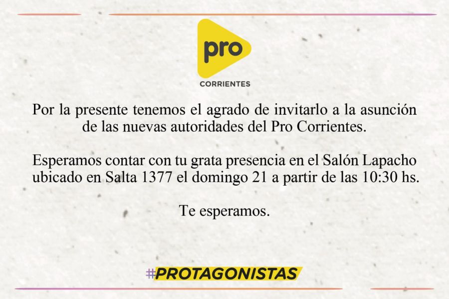 La conducción electa del Propuesta Republicana Corrientes asumirá este domingo, a las 10 horas, en el Salón Lapacho, sobre Salta 1377, de la Ciudad de Corrientes.