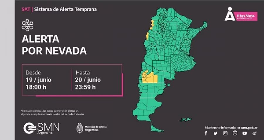 A través de su cuenta personal de Twitter el Servicio Meteorológico Nacional realizó una nueva alerta de nivel amarilla por posibles nevadas fuertes para algunas zonas de las provincias de nuestro país.