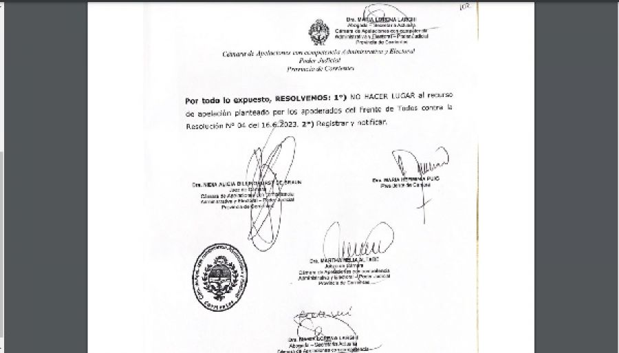 Se coinoció en un comunicado oficial que ha resuelto "no hacer lugar al recurso de apelación planteado por los apoderados del Frente de Todos contra la Resolución N 4 del 16-06-2023"