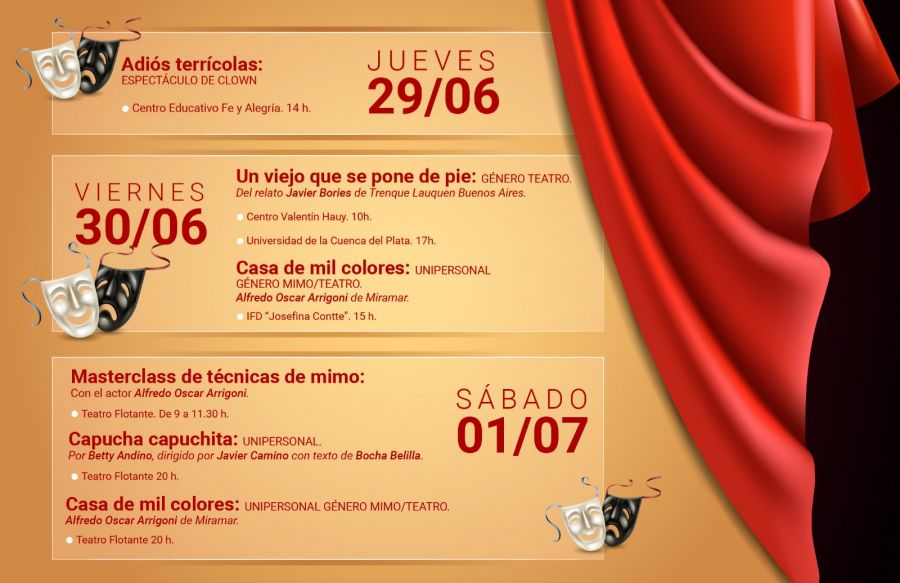 Ese mismo día a las 15 horas, en el Instituto de Formación docente “Josefina Contte” mimo/teatro “Casa de mil colores” con Alfredo Arrigoni de la ciudad de Miramar. En tanto a las 17 horas, en la Universidad de la Cuenca del Plata, la obra “Un viejo se pone de pie” con Javier Bories.