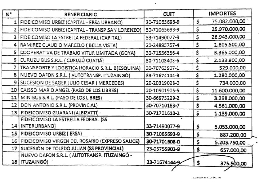 De acuerdo al detalle la empresa Fideicomizo Urbiz Capital Ersa Urbano recibió 70.082.000 pesos, Fideicomizo Urbiz Capital Transporte San Lorenzo 25.970.000 pesos, Fideicomiso La Estrella Federal Capital 26.943.000 pesos, Ramirez Claudio Marcelo de Bella Vista 1.805.500 pesos, Cooperativa de Trabajo Vitur Limitada de Goya 3.365.000 pesos, Curuzú Bus Srl de Curuzú Cuatiá 2.133.800 pesos, Transporte Logística Horacio Srl de Esquina 529.000 pesos, Nuevo Dafón Srl de Ituzaingó 1.280.000 pesos, Sucesión de Sager Julio César de Mercedes 734.000 pesos, Cassio Mario Ángel de Paso de los Libres 11.600.000, Minibus Srl de Paso de los Libres, 3.298.000, Don Antonio Srl de jurisdicción provincial 4.561.000, Fideicomiso Guaraní Albizatti 1.139.000 pesos, Fideicomiso La Estrella Federal Interurbano 5.053.000.
