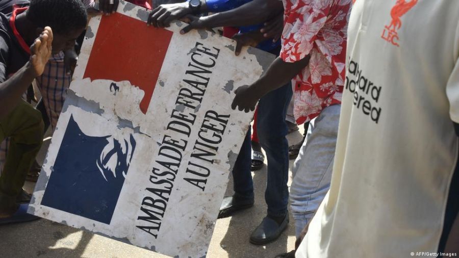 Mientras algunos de los manifestantes insistían para entrar en la embajada, otros arrancaron la placa "Embajada de Francia en Níger" y la pisotearon, antes de reemplazarla por banderas rusas y nigerinas.