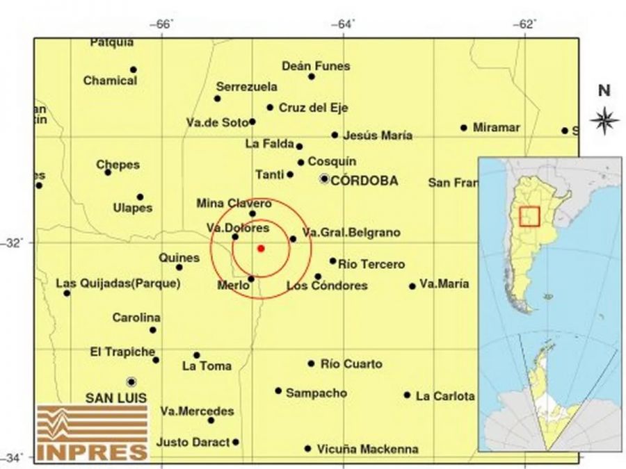 El sismo tuvo epicentro a 30 kilómetros al sureste de Villa Dolores, a 100 kilómetros al sudoeste de Córdoba y a 192 kilómetros al noreste de San Luis, según precisó el Instituto Nacional de Prevención Sísmica (Inpres) en su informe oficial.