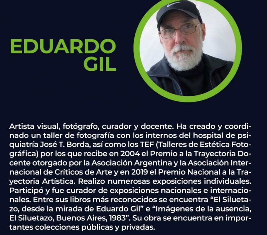 Eduardo Gil es artista visual, fotógrafo, curador y docente. Estudió sociología. Desde 1981 fue colaborador free-lance de los principales medios de prensa de Buenos Aires.