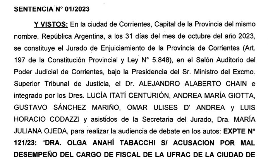 La sentencia Nº 01/2023 da a conocer los fundamentos de la destitución por mal desempeño en sus funciones contra la Dra. Olga Anahí Tabacchi, ahora ex Fiscal de la Unidad de Recepción y Análisis de Casos (UFRAC) de la ciudad de Santo Tomé.