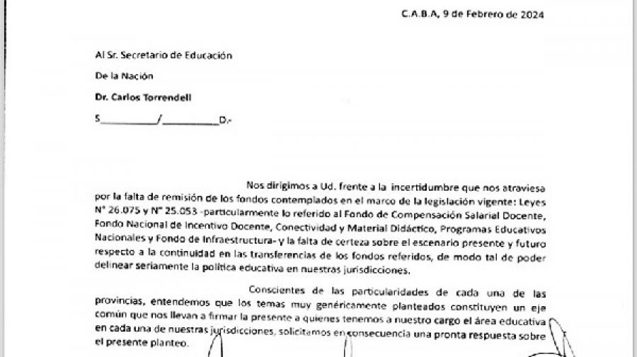 En la carta dirigida al secretario de Educación nacional los ministros señalan la "incertidumbre" por la que atraviesan debido a "la falta de remisión de los fondos contemplados en el marco de la legislación vigente: leyes número 26075 y 25 250 53 ".