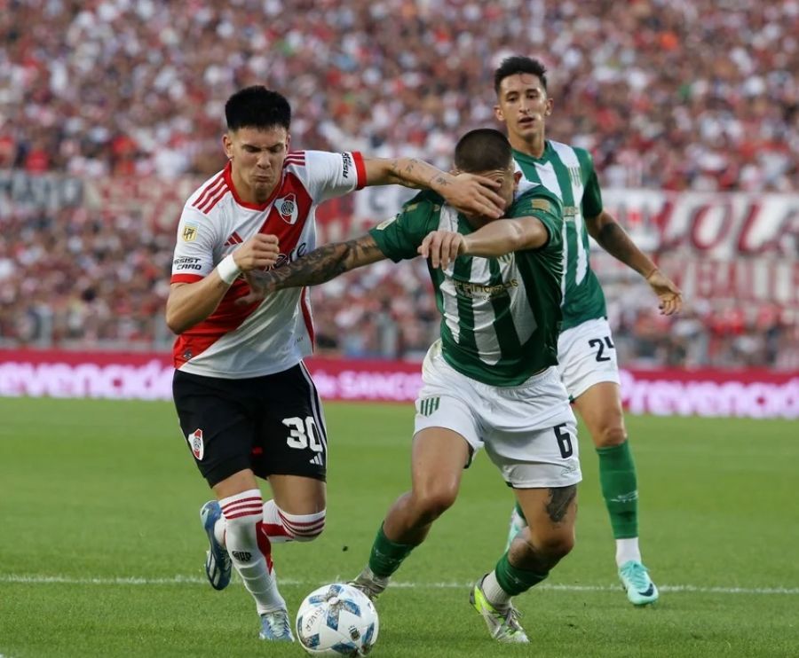 Apenas unos minutos después, Esequiel Barco tomó la lanza en la ofensiva y después de eliminar a dos defensores en el borde del área, le metió el centro para la cabeza de Solari que estampó el 1 a 1 a favor de River