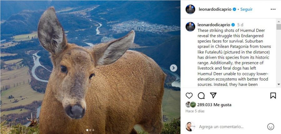 La conocida faceta ecologista del actor Leonardo DiCaprio tuvo una nueva expresión esta semana, cuando a través de su cuenta de Instagram manifestó su preocupación por el futuro que espera a los huemules, unos ciervos que habitan en el sur de Chile y Argentina y que se encuentran en crítico peligro de extinción.