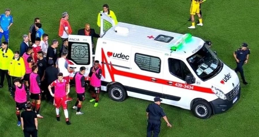 El personal de seguridad formó un cordón para preservar al jugador de las cámaras de televisión hasta que una ambulancia ingresó al césped para trasladar al volante al Instituto Médico Platense.