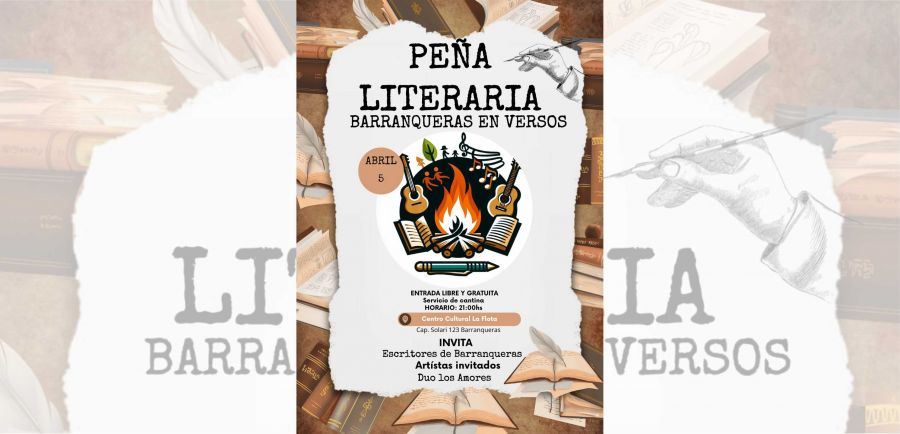 Este viernes 5 de abril a las 21:00 hs, en el Centro Cultural “La Flota”, se realizará una peña literaria, organizada por escritores de Barranqueras.