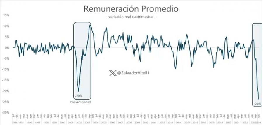 Los salarios de los trabajadores tuvieron una caída del 26% interanual en febrero, según los cálculos del economista Salvador Vitelli, quien aportó que con el retroceso del segundo mes del año se alcanzó la peor caída cuatrimestral en la historia del índice. En este sentido superaron el derrumbe de la convertibilidad en cuanto a un periodo de cuatro meses, que fue del 20%, y se acercan al mínimo mensual.
