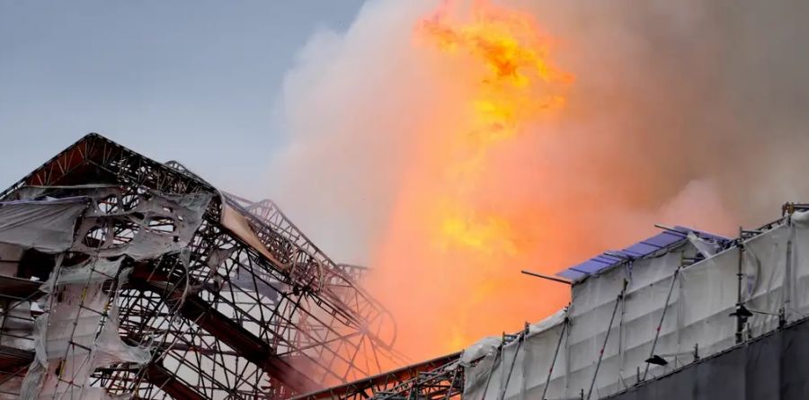 Un gran incendio se declaró este martes (16.04.2024) en el edificio de la antigua Bolsa de Copenhague, del siglo XVII, y su emblemática flecha se derrumbó entre las llamas, constató una periodista de la AFP.