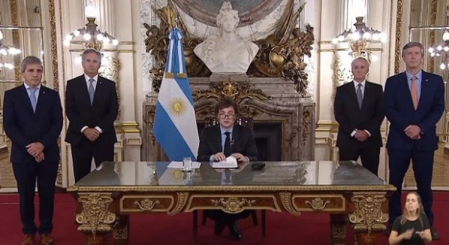 "El déficit cero no es una consigna de marketing para este Gobierno, es un mandamiento", insistió Milei durante la cadena grabada a la tarde en el Salón Blanco de Casa Rosada y emitida a las 21:00, acompañado por el ministro de Economía Luis Caputo, el presidente del Banco Central Santiago Bausili y su vice Vladimir Werning, además del secretario de Finanzas Pablo Quirno.