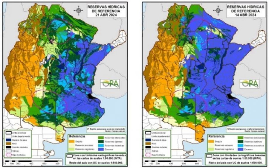 Como cada semana, el informe de la ORA incluye mapas con la estimación de contenido de agua en el primer metro de suelo, que este lunes fueron elaborados considerando una cobertura de pastura (implantada o natural, según la zona).
