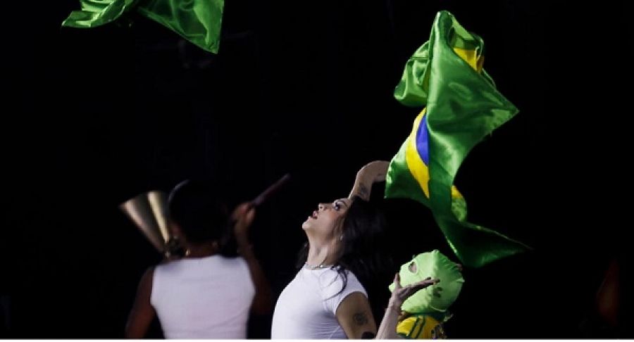 Madonna sostiene banderas brasileñas mientras ensaya antes de su concierto en la playa de Copacabana, en Río de Janeiro, Brasil, 2 de mayo de 2024. © Pilar Olivares / AP