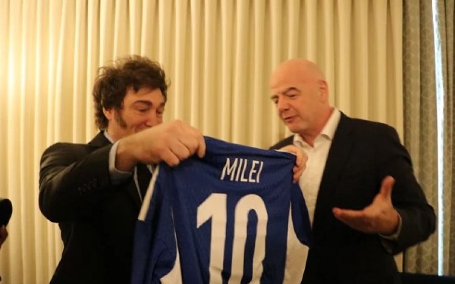 Tras el encuentro se difundieron fotos de ambos luciendo distendidos y sonrientes, en las que se observa que el mandamás del fútbol le regaló a Milei un banderín de la FIFA, una pelota y una camiseta con el apellido del presidente argentino en la espalda.