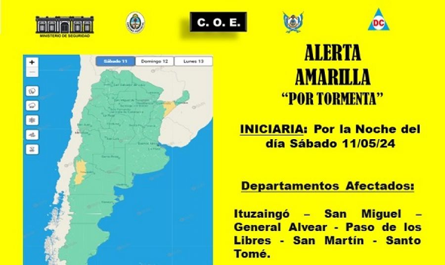 Desde el Comando Operativo de Emergencias (COE) de la Provincia advierten que, los departamentos correntinos de Ituzaingó, San Miguel, General Alvear, Paso de los Libres, San Martín y Santo Tomé, entran desde la noche de este sábado en Alerta Amarilla "por tormentas".