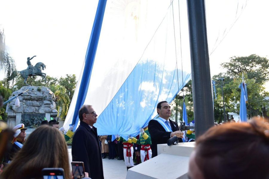 Ambos mandatarios presidieron el izamiento de la bandera en la plaza 25 de Mayo y luego compartieron un chocolate patrio en la Casa de Gobierno con los vecinos que se acercaron a festejar esta fecha. También juntos asistieron al Tedeum en la iglesia La Merced y finalmente disfrutaron del desfile de instituciones escolares, civiles y militares.