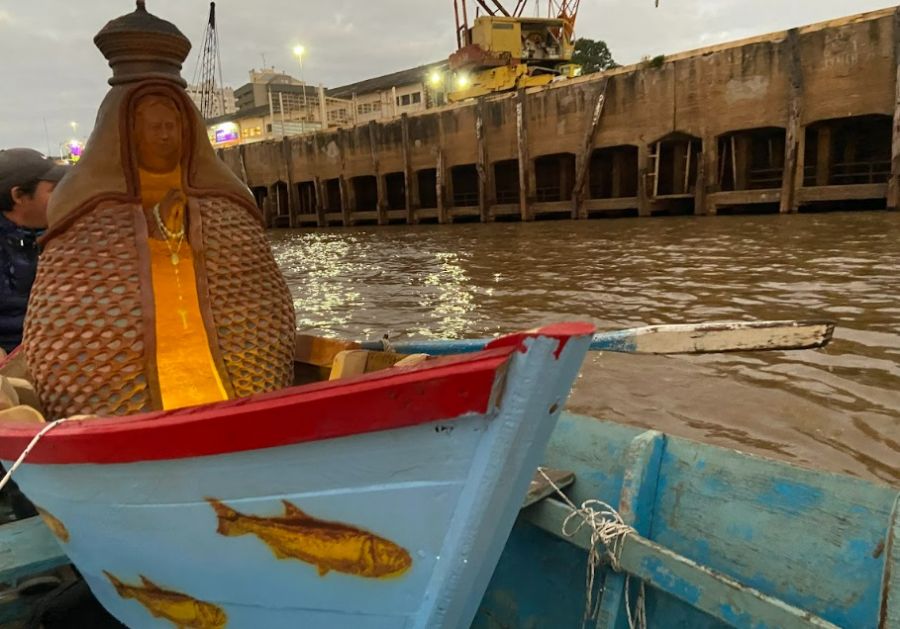 Llegaban al puerto las canoas de pescadores del barrio de Itatí de la ciudad de Corrientes, con sus virgencitas de barro como mascarones de proa. Van escoltadas por artistas amigos de Richar De Itatí y seguidores de su arte. En medio había una especial, más pequeña (180cm), de construcción artesanal realizada por carpinteros especialistas de Itatí, los hermanos Gayoso, intervenida con colores y stencil por el artista Hernán Ramírez. Lleva a bordo a la Virgen más grande.