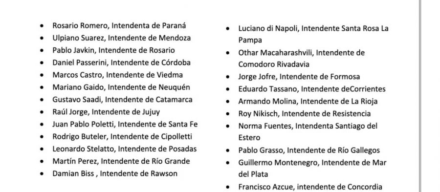 La firman los intendentes Daniel Passerini, de Córdoba; Jorge Jofré, de Formosa; Rosario Romero, de Paraná; Ulpiano Suárez, de Mendoza; Pablo Javkin, de Rosario; Marcos Castro, de Viedma; Mariano Gaido, de Neuquén; Gustavo Saadi, de Catamarca; Raúl Jorge, de Jujuy, Juan Pablo Poletti, de Santa Fe; Leonardo Stelatto, de Posadas, Rodrigo Buteler, de Cipolletti, Martín Pérez, de Río Grande, Tierra del Fuego; Othar Macaharashvili, de Comodoro Rivadavia; Eduardo Tassano, de Corrientes; Armando Molina, de La Rioja, Roy Nikisch, de Resistencia; Norma Fuentes, de Santiago del Estero; Pablo Grasso, de Río Gallegos; Emiliano Durand, de Salta capital; Francisco Azcue, de Concordia, Entre Ríos, y Damián Biss, de Rawson, Chubut.