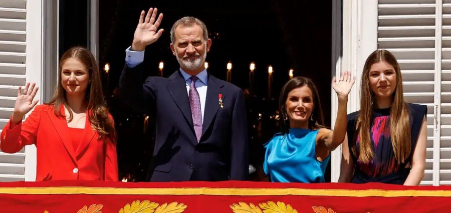 Después, ya en el Palacio Real, tuvo lugar el relevo solemne de la Guardia Real, que los reyes, Felipe VI y Letizia, y sus hijas, la princesa Leonor y la infanta Sofía, presenciaron desde el balcón central del Salón del Trono del palacio, que da a esa plaza, donde se asomaron por primera vez. Tras la parada militar, se impusieron condecoraciones en el Salón de Columnas, como ya se hizo en 2015 y en 2019, en el primer y quinto aniversario de la proclamación, y en 2021, como homenaje a personas que trabajaron en la primera línea frente a la pandemia.