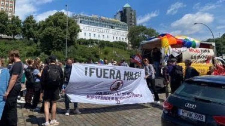 El presidente Javier Milei llegó a Alemania, Hamburgo, para recibir otro premio en el marco de un nuevo viaje presidencial, y fue recibido por cientos de manifestantes que protestan contra su modelo ideológico: "Miseria neoliberal".